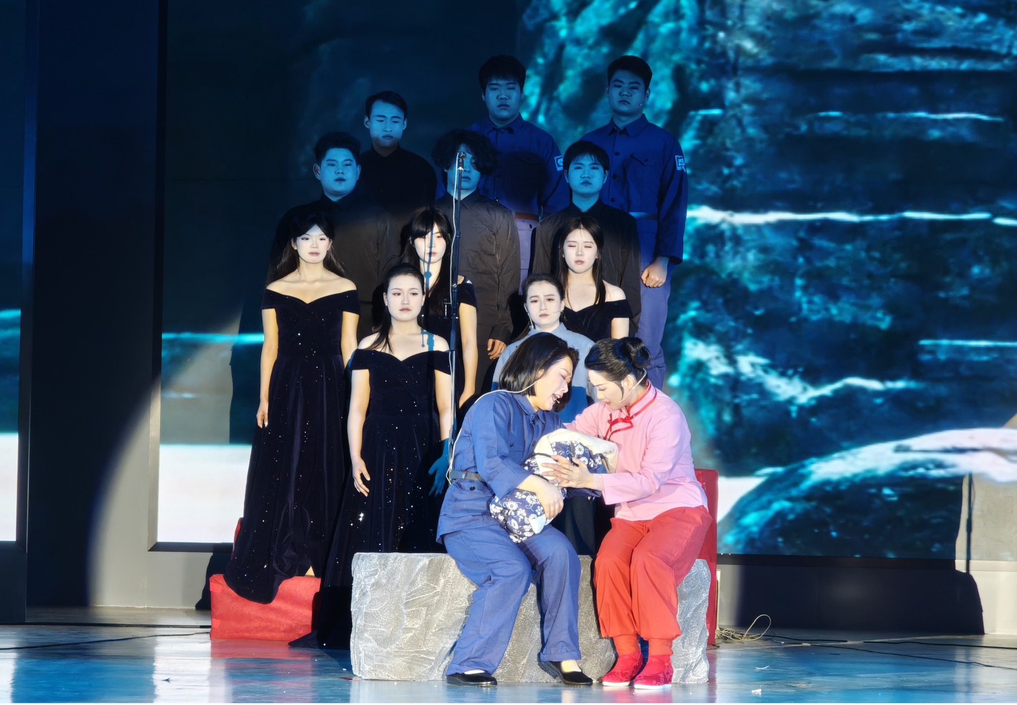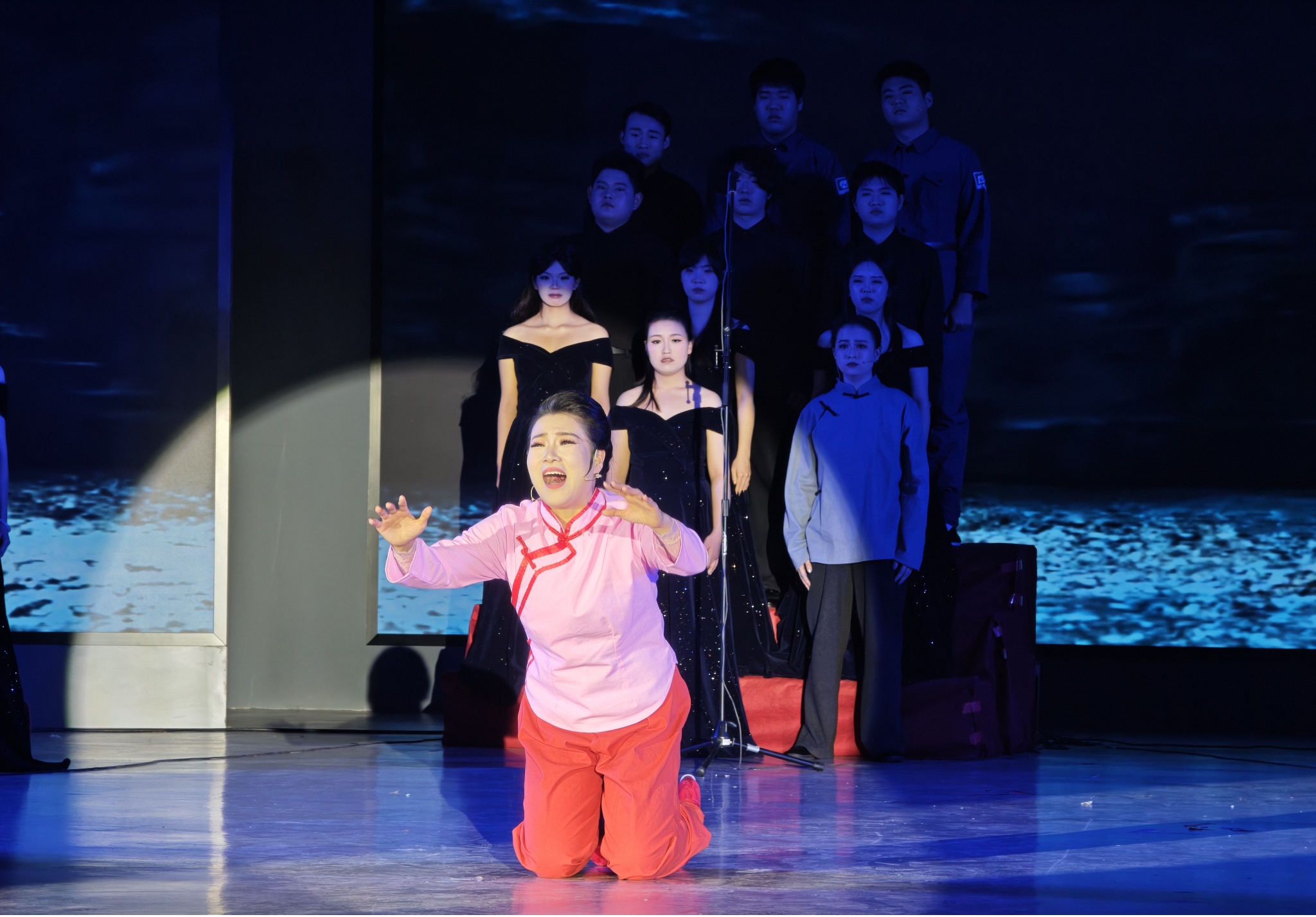 本场演出以18个节目串联起沂蒙老区的革命群像,节目单里的每一曲都成为精神谱系的生动注脚:开场《感谢亲人子弟兵》中,海棠(张影饰)、孙九龙(杜昂饰)、林生(董荻饰)的合唱,唱出了军民鱼水情的质朴底色;《当兵就要当八路》里,夏荷(刘永姣饰)、小八路(张文旭饰)的热血唱腔,诠释了革命青年的信仰抉择;《一双鞋子针儿密》的细腻对唱,将“水乳交融、生死与共”的沂蒙精神具象为针线里的牵挂;从《怎么办?怎么办?》的焦灼群戏,到《世间哪有这样的情》的赤诚咏叹,再到终曲《沂蒙山,永远的爹娘》的深情合唱,师生们以专业表演,让“党群同心、军民情深”的精神内核在舞台上落地生根。